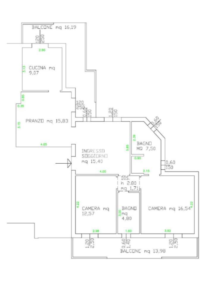 La disposizione interna comprende un ampio ingresso, soggiorno spazioso e luminoso servito da porta finestra che conduce al balcone abitabile e cucina spaziosa. Nella zona notte sono presenti due spaziose camere da letto e due bagni , entrambi finestrati, uno con box doccia (cromoterapia) e uno con vasca. Anche nella zona giorno vi è un balcone spazioso. Al piano terra garage.