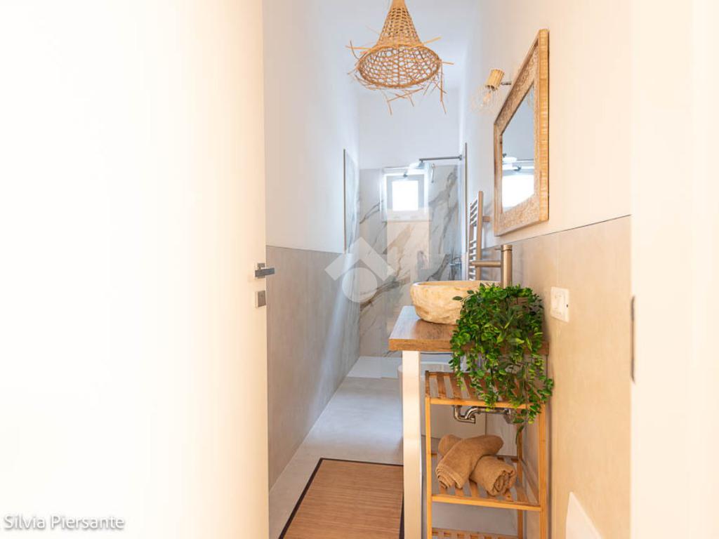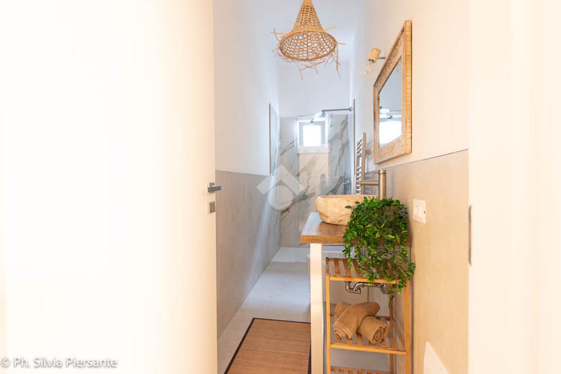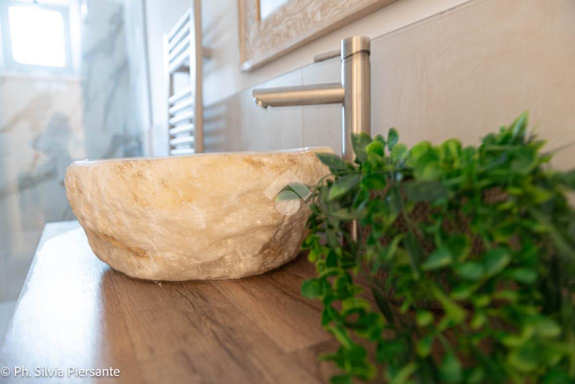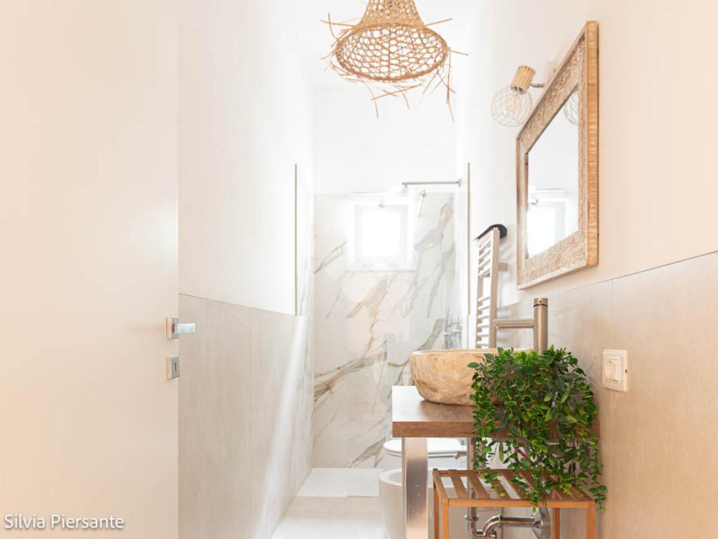 Il corridoio, con le sue tonalità calde, guida verso la zona notte. La prima porta conduce alla cameretta, perfetta come stanza per i ragazzi, studio creativo o camera degli ospit si incontra un bagno luminoso, impreziosito da finiture pregiate, con lavabo in marmo di Bali e richiami agli elementi naturali tipici di quelle terre lontane: un ambiente che diventa ogni giorno un’oasi di benessere.